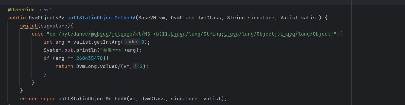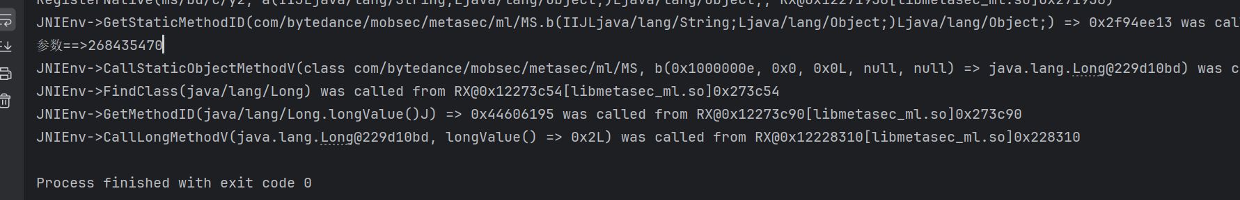 MS = vm.resolveClass("com.bytedance.mobsec.metasec.ml.MS",vm.resolveClass("ms.bd.c.i2",vm.resolveClass("ms.bd.c.y2")));