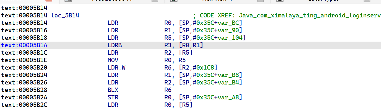 发现都是从寄存器 r0 中进行取值,得到最终的结果,偏移为: 0x05b1b