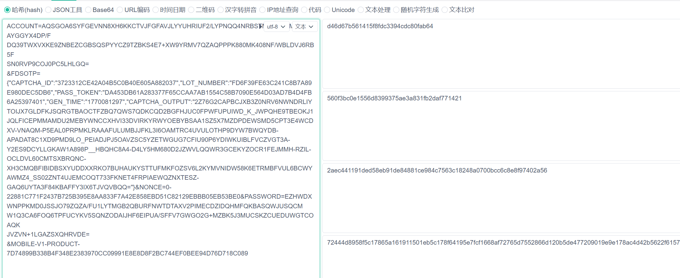 SHA1 ,他在请求参数后面拼接了一个固定的值: MOBILE-V1-PRODUCT-7D74899B338B4F348E2383970CC09991E8E8D8F2BC744EF0BEE94D76D718C089 然后 sha1 就没了