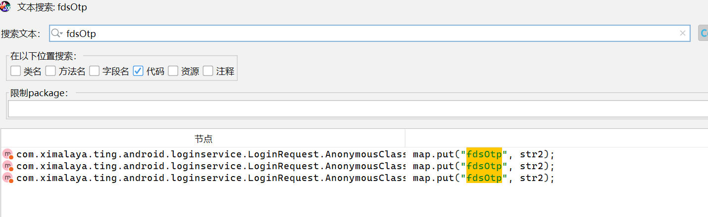 fdsOtp 这个字段挺特殊的,直接在 jadx 中搜索,发现了 3 个地方